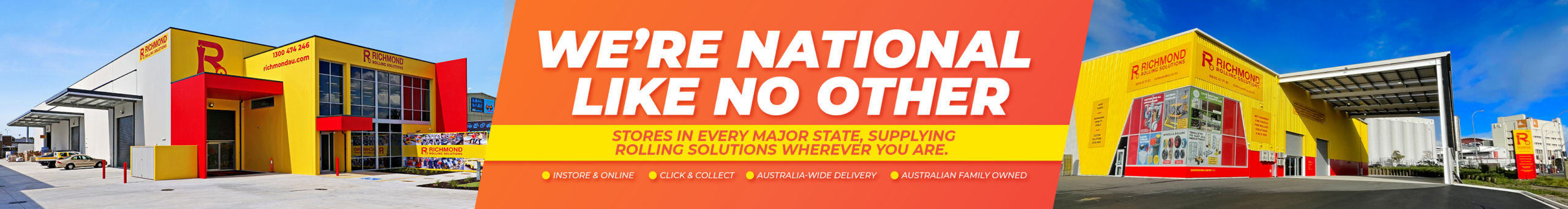 We’re an Australian family owned and operated company designing, manufacturing, and supplying rolling solutions for a number of industries. We have grown to be a leading manufacturer and supplier of premium quality non-marking wheels, castors, lifting equipment, and over 8000 other items. With multiple branches across Australia and New Zealand, we are widely recognised as your trusted manufacturer and supplier of Richmond castors, industrial wheels, plastic storage, plastic wheels, steel rollers wheels, conveyor, gate hardware, hand trolleys, materials handling equipment, and more.