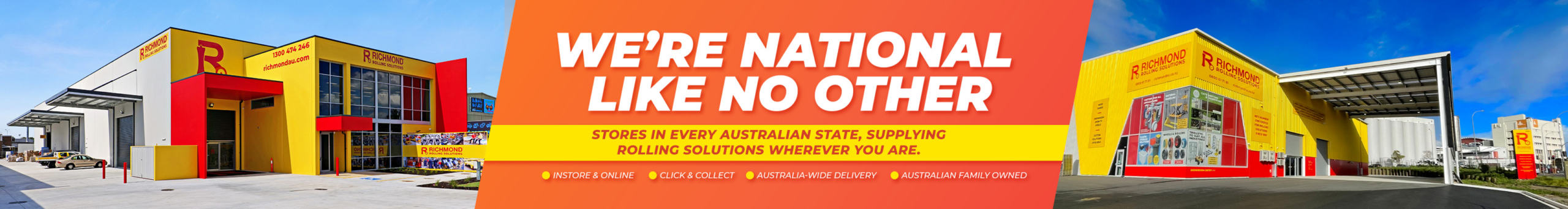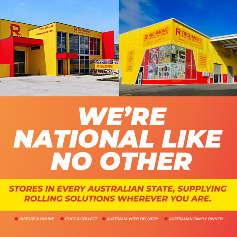 We’re an Australian family owned and operated company designing, manufacturing, and supplying rolling solutions for a number of industries. We have grown to be a leading manufacturer and supplier of premium quality non-marking wheels, castors, lifting equipment, and over 8000 other items. With multiple branches across Australia and New Zealand, we are widely recognised as your trusted manufacturer and supplier of Richmond castors, industrial wheels, plastic storage, plastic wheels, steel rollers wheels, conveyor, gate hardware, hand trolleys, materials handling equipment, and more.