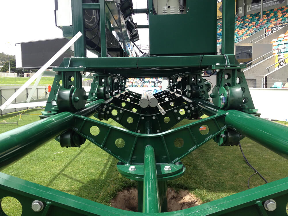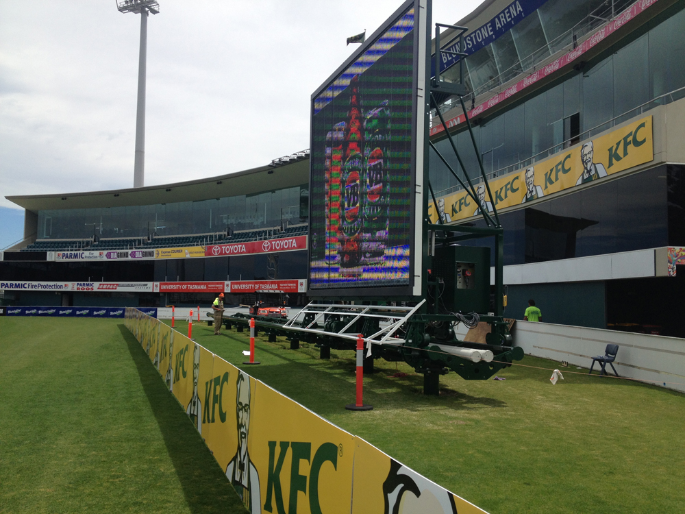 Complete plug and play traction drive and support solution for 2 x removable cricket ground sight screen system in Hobart Australia with electronic display screens.