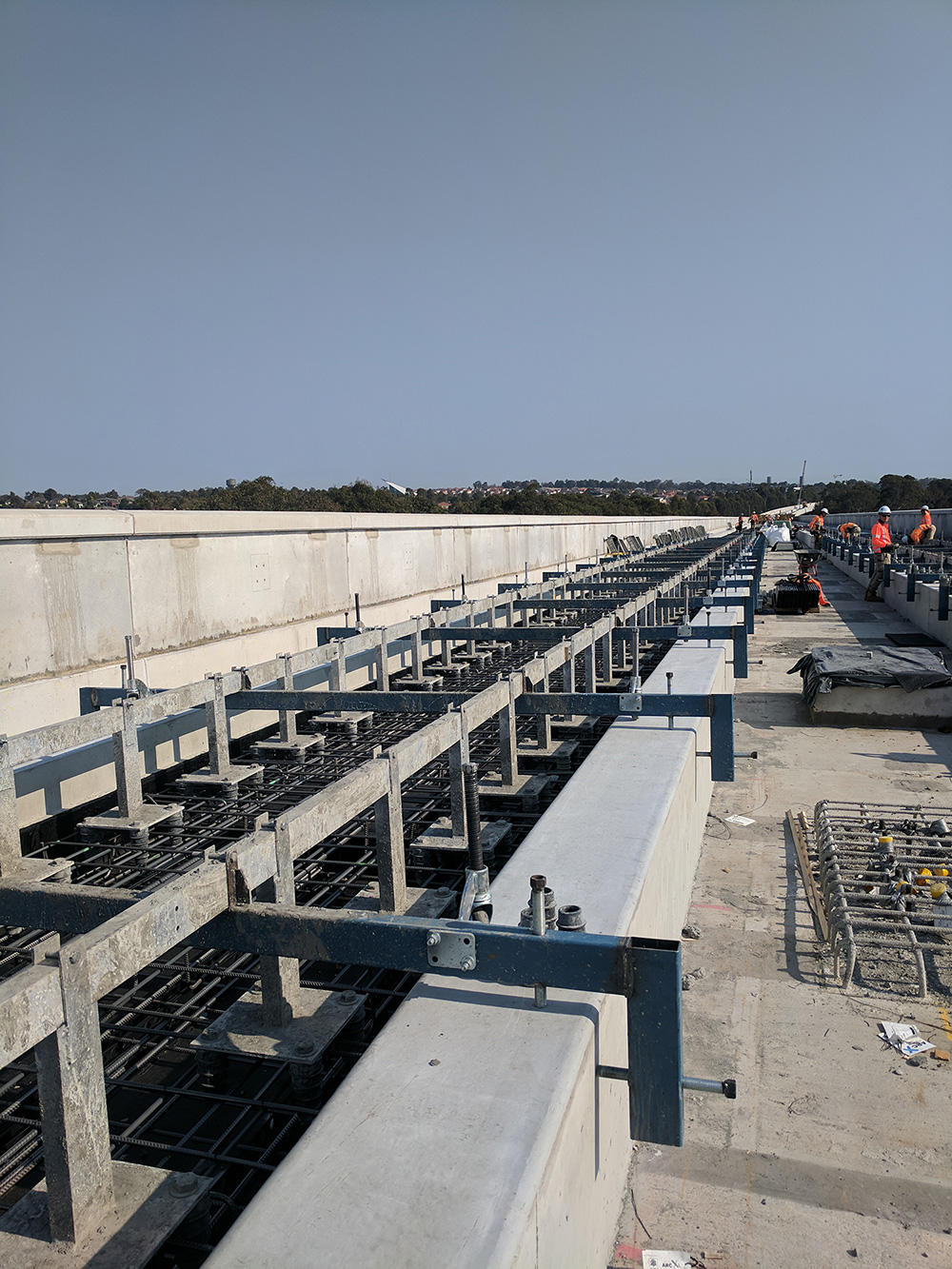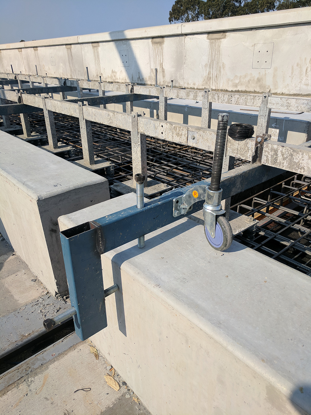 The castors are used to raise a lightweight aluminium platform off the ground, and allow linear travel along a concrete abutment. Once in the new position, the castors are lowered back to the ground to allow the platform to be used.