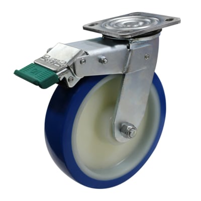 They are available in wheel diameters of 100mm, 125mm, 150mm or 200mm. These heavy duty castors are available in swivel, rigid, swivel with brake, swivel with directional lock, swivel with side brake or swivel with swivel lock and brake combinations. Depending on the wheel type, bearing types include ball bearing, bronze bush, oilless DU bush, plain bore, roller bearing or stainless steel roller bearing.
