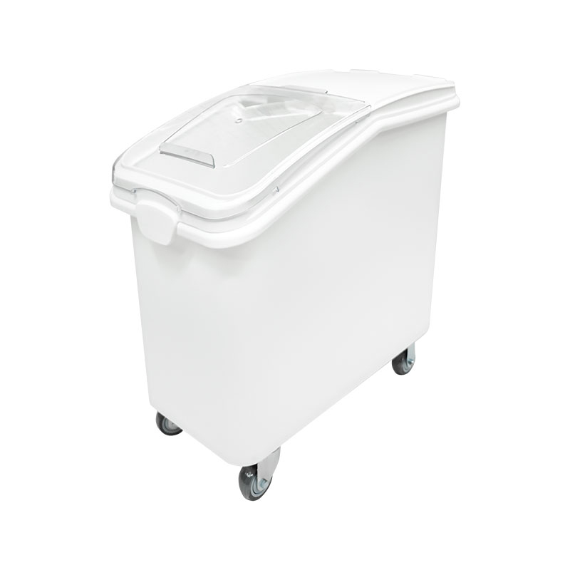 102L food-grade polypropylene ingredient bin with clear hinged lid and castor wheels for safe, mobile storage of large dry ingredient quantities in commercial kitchens, bakeries, and food production environments.
