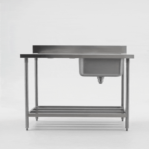 Stainless steel bench with right-hand sink, ladder base, and splashback—built for hygienic, high-throughput work areas.
