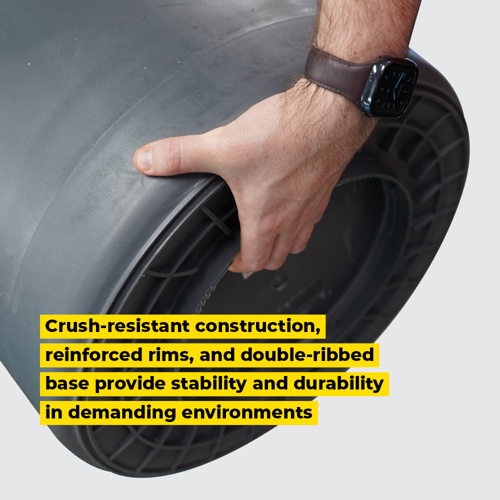 - Crush-resistant polypropylene construction: withstands heavy impacts and harsh conditions without rusting, chipping, or peeling