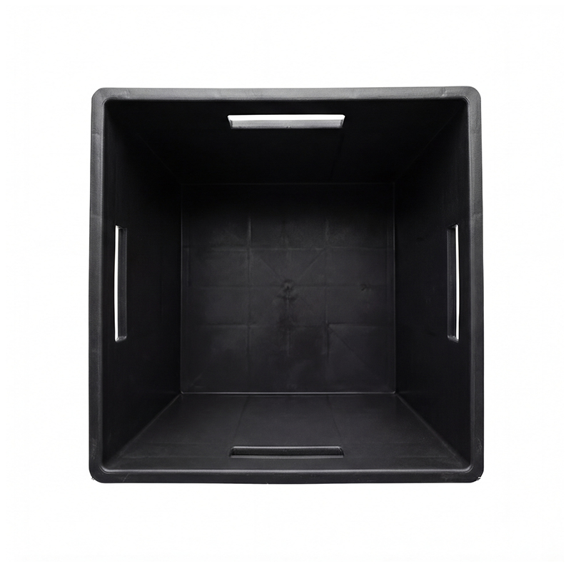 The reinforced ribbed base and outer walls help maintain structural integrity under load, while the smooth internal surface allows for easy cleaning. Its square footprint makes it suitable for shelving systems, pallet storage, service vehicles, and general site use.