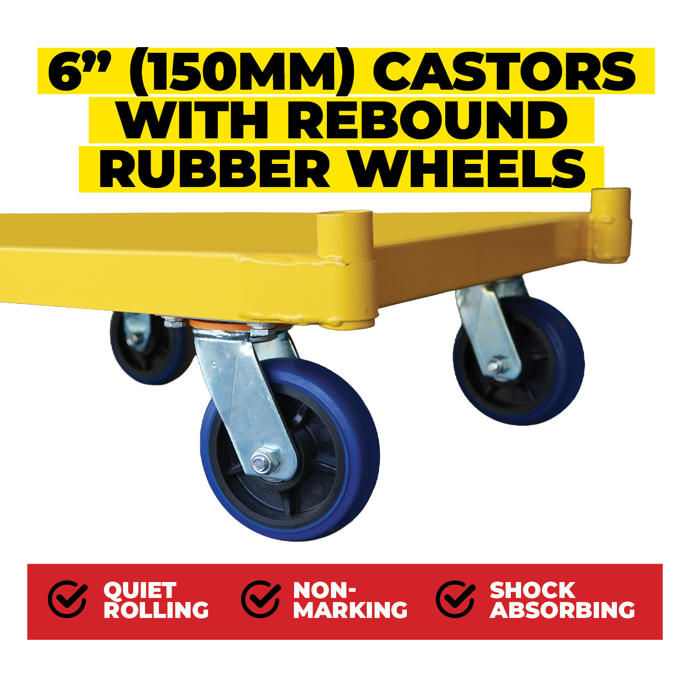 Built around a six wheel layout, the trolley delivers improved stability and weight distribution compared to standard platform trolleys. It is supplied with 6 inch blue rubber castors, configured as 2 rigid and 4 swivel, helping the trolley track straight when required while remaining easy to manoeuvre in tighter areas. Castors are supplied with fasteners for direct attachment to the frame. The trolley is finished in a yellow powder coat for a durable, hard-wearing surface.