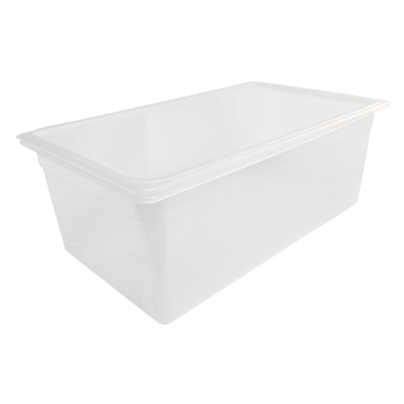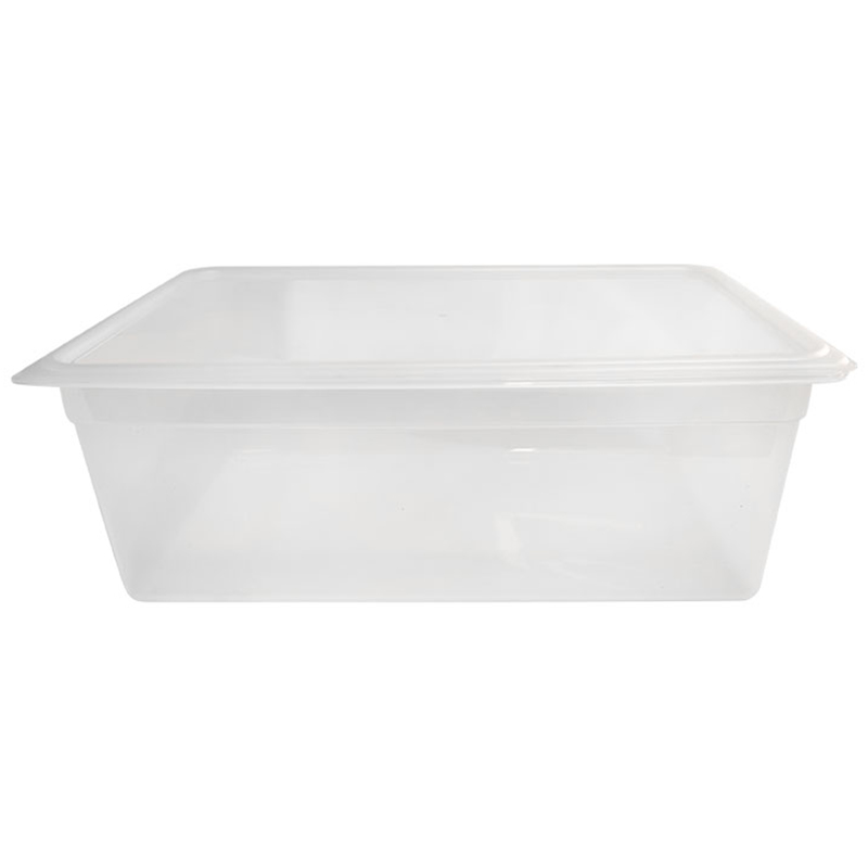 Clear polypropylene food pan with lid for hygienic ingredient storage and easy identification in commercial kitchen and catering environments.
