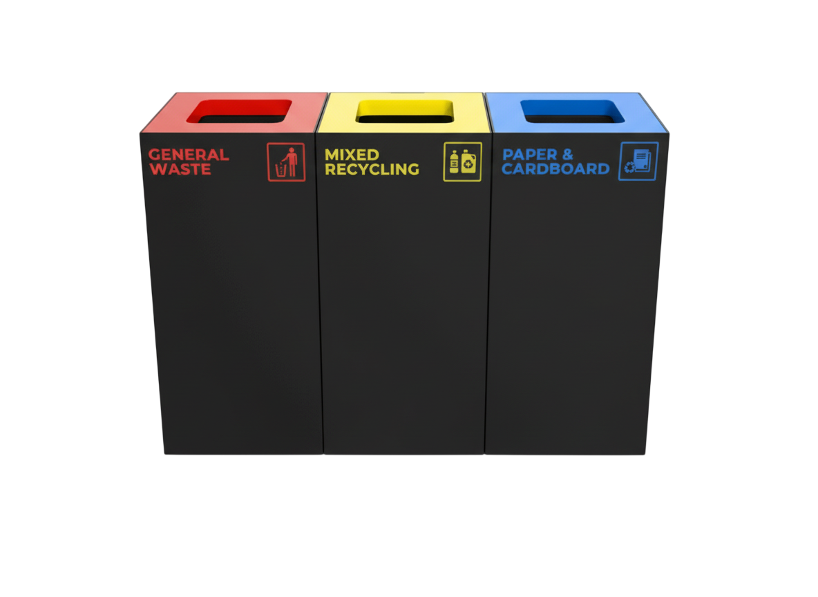 Each bin features a colour-coded lid insert: red for general waste, blue for mixed recycling, and yellow for paper and cardboard. This clear visual guidance helps users sort waste correctly at the point of disposal. Designed as a modular system, additional bins can be added to support expanded waste stream requirements across the site.